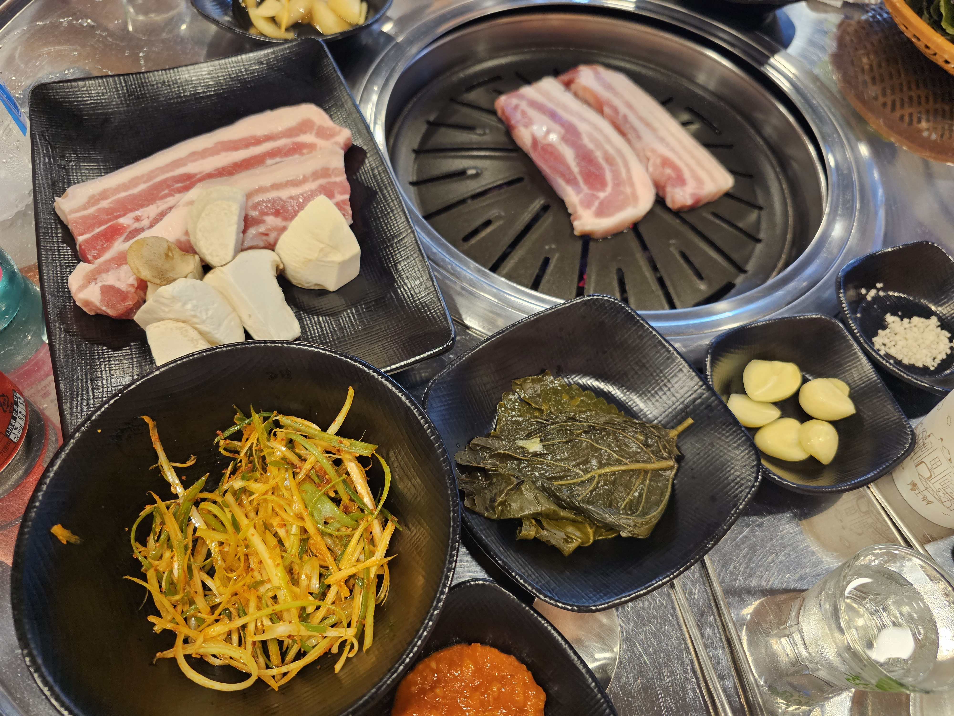 삼겹살도 먹고 또 껍데기도 있더라구요. 껍데기는 두꺼운 스타일은 아니고 옛날스타일의 얇은 껍데기 입니다. 그래도 냄새 하나 없이 너무 맛잇게 잘먹었습니다. 고기가 전체적으로 선도가 좋아 육즙이 풍부하게 나와 맛있게 먹었습니다.