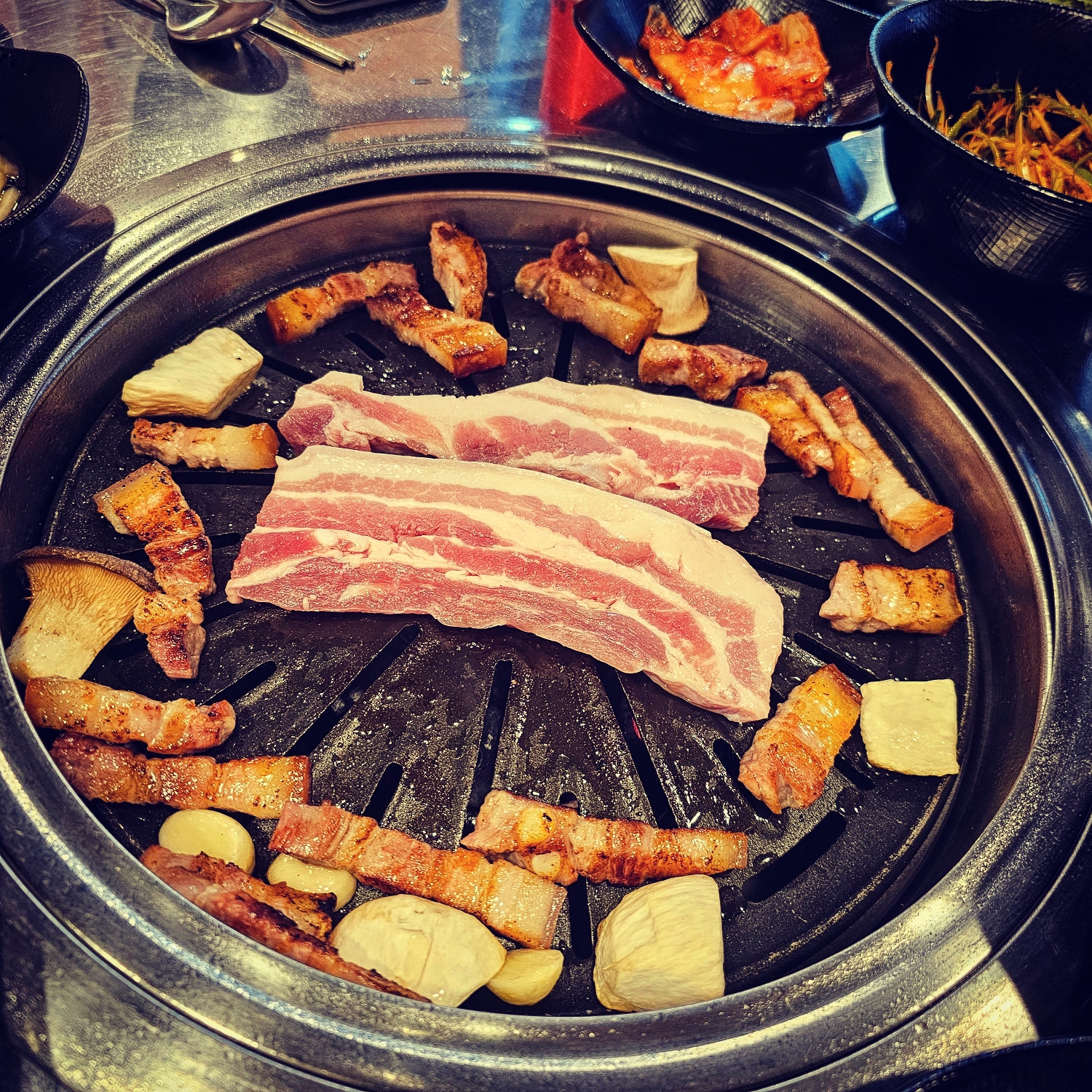 고기 등장!!!!! 이미 1인분 기준입니다. 2인분을 주문했지만 이미 두덩어리는 불판에서 익어가고 있기때문입니다.ㅋㅋㅋ